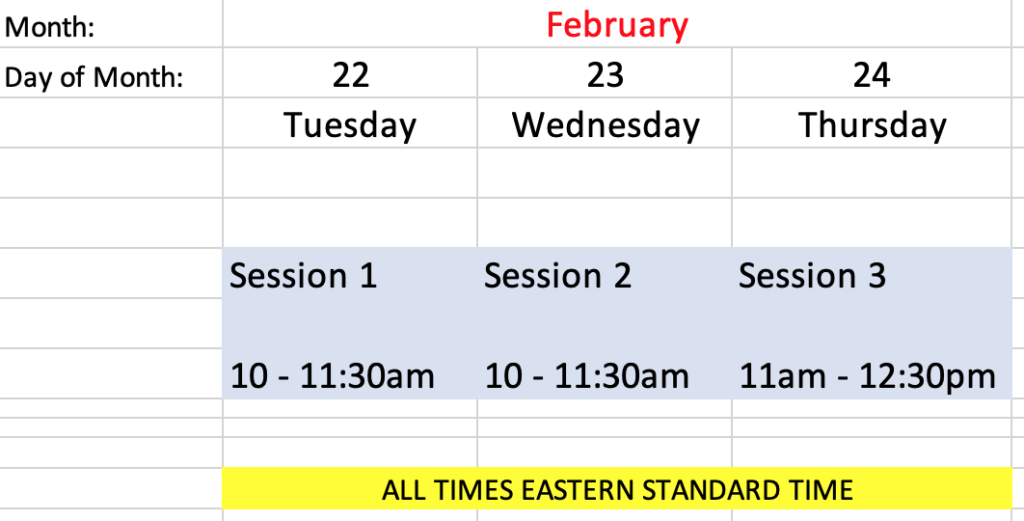 Just find the appropriate days and mark your calendar accordingly, then use either the session links (which you can copy/paste into your calendar meeting) or the Join Buttons by the appropriate session above.